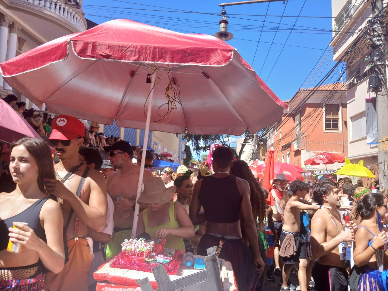 São carrinhos com isopores de bebidas e até barracas de espetinho, a ponto de foliões se machucarem com o fogo usado no preparo dos alimentos. Em meio à aglomeração, o risco aumenta enquanto os vendedores avançam pela multidão e ocupam boa parte da via.