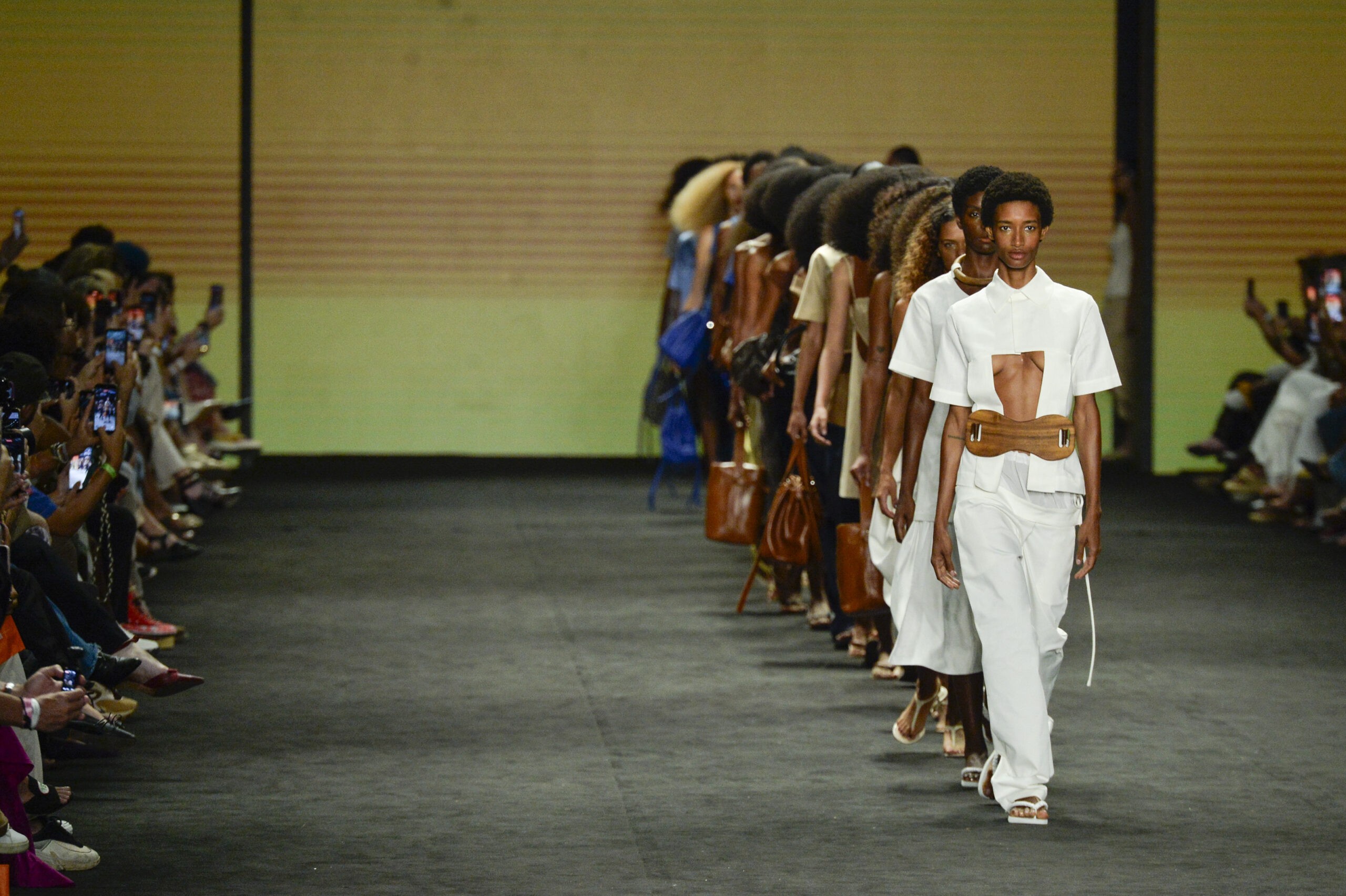 Há sobreposições, tramas têxteis, aplicações florais e blusas de um ombro só. Algumas produções trazem sobreposições que remetem a calcinhas usadas sobre calças. Os cintos de madeira, resultado de parceria com oito artesãos surgem como elemento estrutural nos looks mais fluidos, com destaque para o último, apresentado como top. Nos pés, nada de sapatos fechados: predominam chinelos e sandálias rasteiras de salto baixo.