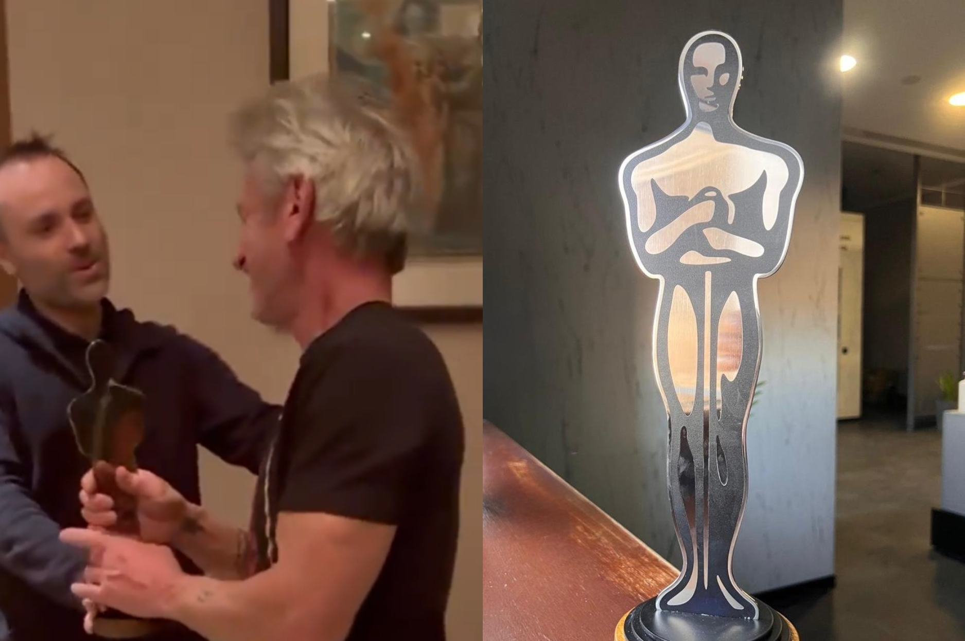 "Foi isso que a sua presença aqui significou. Você está perdendo o Oscar, então fizemos este para você. Isso veio de um vagão de trem que foi danificado pelos russos. O metal sobreviveu, então é muito especial para nós. Não é dourado, mas é muito real e vem do fundo do coração", afirma Pertsovskyi. "Todos são tesouros, obrigado", responde Penn.