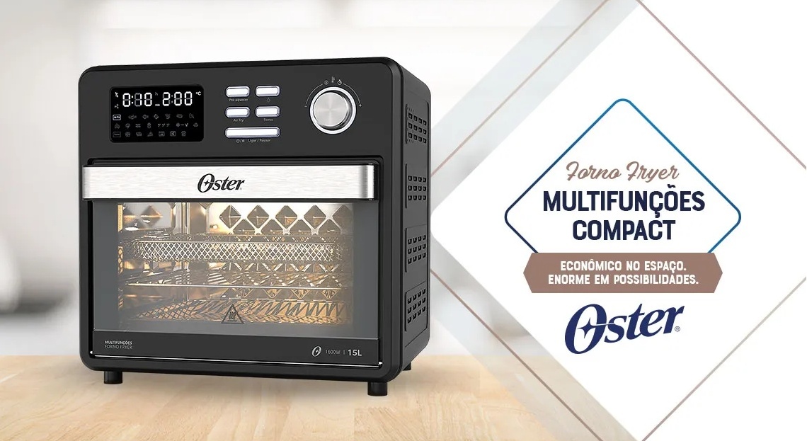 Oster Forno Fryer 15L com 50% off: 10 funções, air fryer, forno, estufa e mais. Descubra por que o tipo forno supera o convencional.
