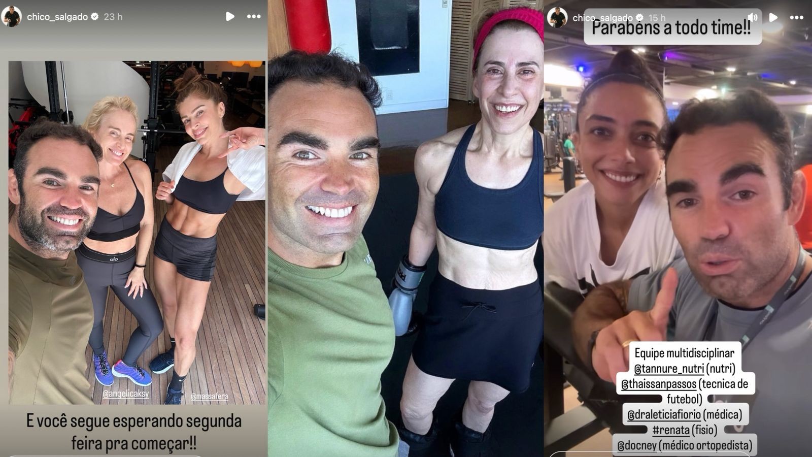 Personal trainer das estrelas, Chico Salgado comemorou o dia de trabalho que teve nesta sexta-feira. De manhã, deu aula para Angélica e Grazi Massafera, juntas; depois, para Fernanda Torres; e, por fim, para Alice Carvalho, que está treinando para interpretar a jogadora de futebol Marta nos cinemas.