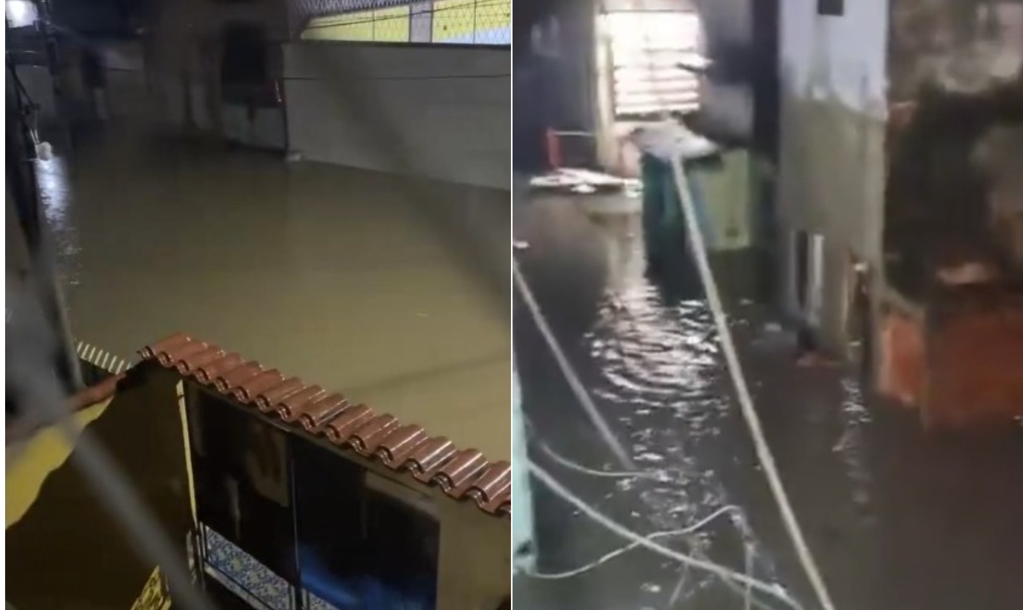 Em outro vídeo em Manguinhos, uma mulher aparece em desespero, com a água chegando à altura do peito, gritando por ajuda em frente à própria casa tomada pela inundação.