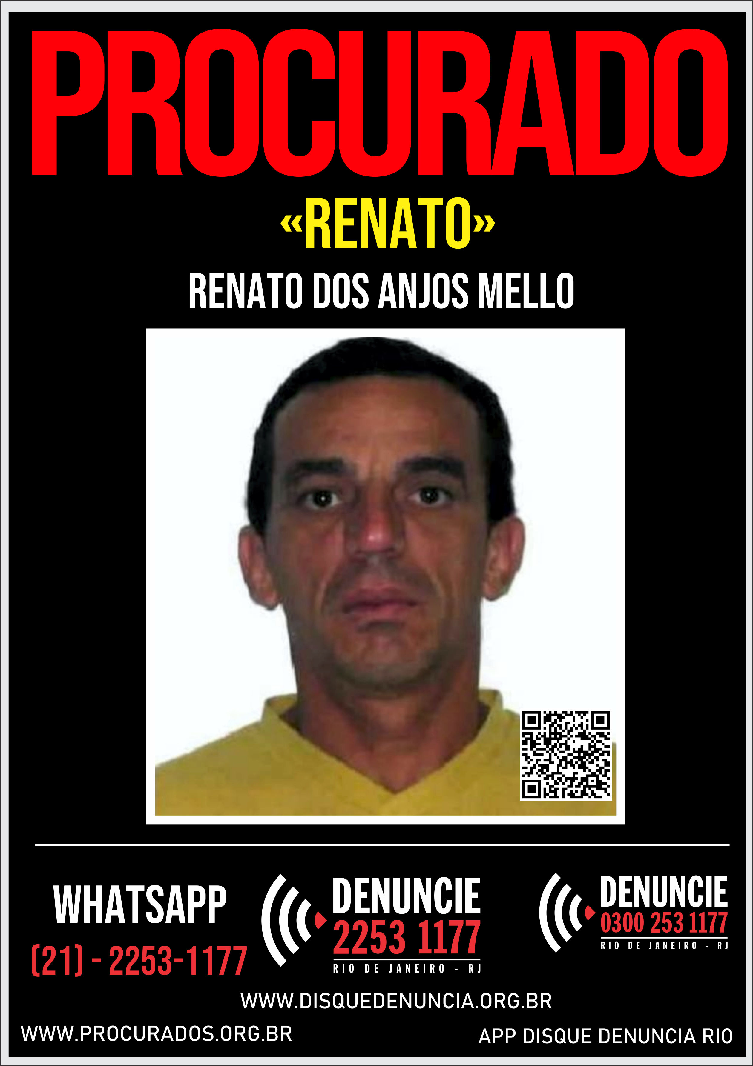 Como ele segue foragido, o Disque Denúncia pede que quem tiver informações sobre a localização de Renato dos Anjos Mello entre em contato pelos seguintes canais de atendimento, com anonimato Garantido: