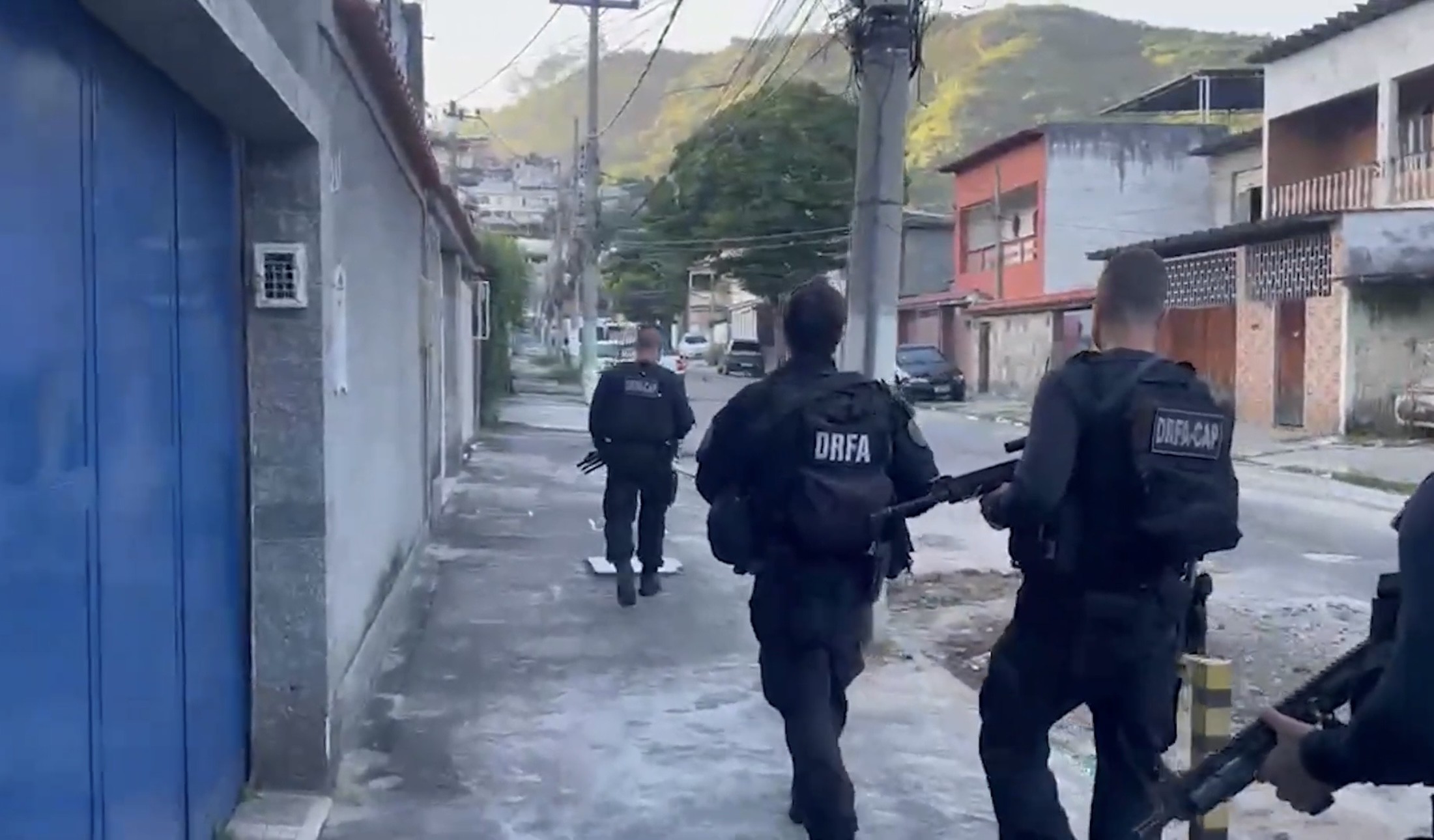 Na área de lazer há pichações com a Estrela de David, símbolo usado pelo traficante Álvaro Malaquias Santa Rosa, o Peixão, um dos chefes do TCP. Na ação foram encontradas também estruturas utilizadas como seteiras — buracos que permitem apoiar armas longas e atirar com maior precisão — pelos criminosos. A operação está em andamento.