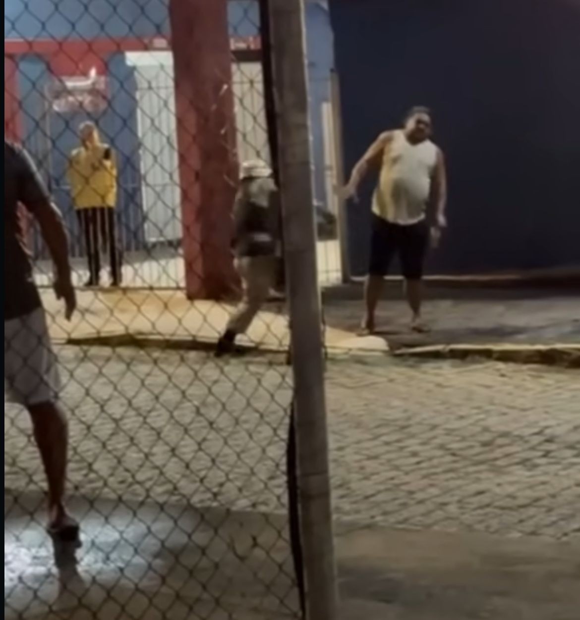 Em outro vídeo compartilhado por Perdigão, é possível ver um homem de roupa branca deitado e protegendo a mão enquanto o ex-jogador continua em pé e discutindo com um dos policiais presentes. Outro oficial dá uma volta por trás do companheiro e acerta Perdigão novamente, falando: "quer tomar mais?".