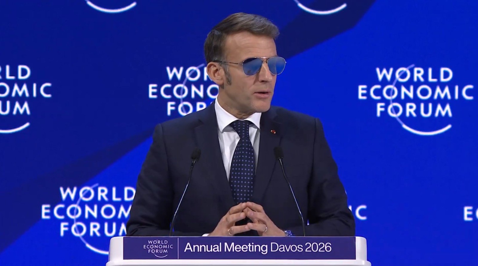 Em discurso no Fórum Econômico de Davos, na Suíça, o presidente da França, Emmanuel Macron, fez diversas indiretas ao presidente dos Estados Unidos, Donald Trump, em meio a tensão na Groenlândia. Mas um dos aspectos que mais chamou atenção do discurso de Macron não foram as falas e sim sua vestimenta. Ele estava com um terno tradicional e um óculos escuro esportivo.