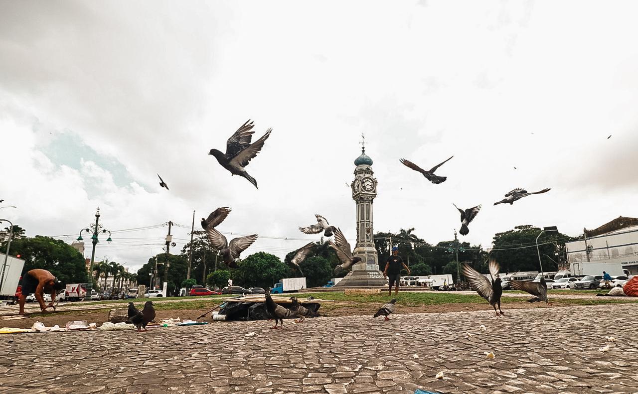 O abandono e a insegurança em áreas que deveriam ser de convivência e cartão-postal do centro de Belém têm sido alvo de denúncias de moradores. Na Praça do Relógio, perto da Pedra do Peixe, no Complexo do Ver-o-Peso, os ponteiros do famoso relógio estão parados em 15h40 e a estrutura está sem manutenção. Urubus dividem espaço ao lado de pessoas em situação de rua. Na Praça Dom Pedro II, localizada em frente ao Palácio Antônio Lemos, sede da Prefeitura de Belém, o lago está esverdeado pelo limo e repleto de lixo, como plástico e vidro. Essa área também é refúgio para pessoas em situação de rua.
