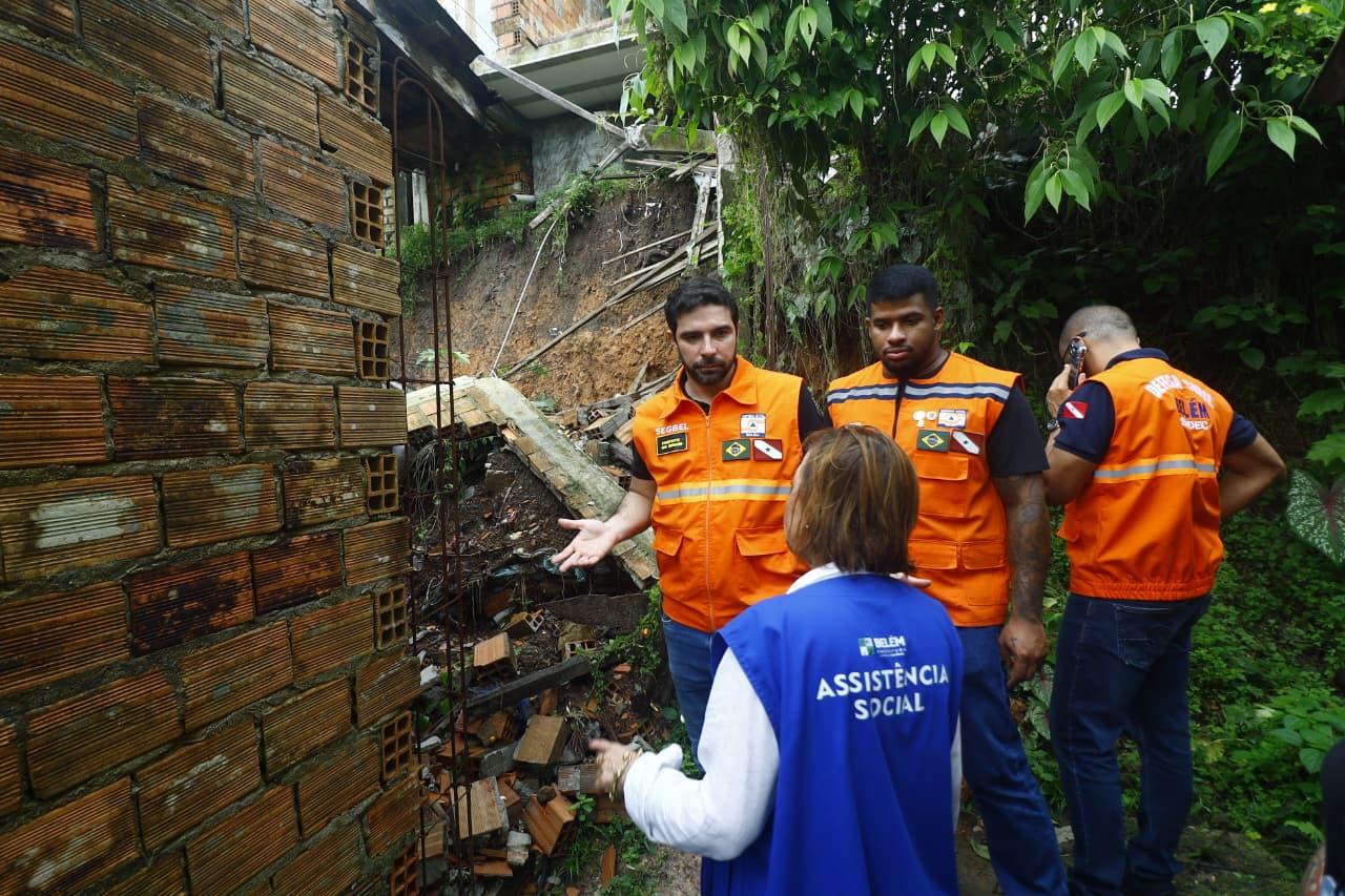 O prefeito de Belém, Igor Normando, visitou, na manhã desta segunda-feira (2), o Conjunto Recanto Verde, no bairro Maracacuera, distrito de Icoaraci, onde um deslizamento de terra atingiu oito casas na madrugada do último sábado (28). Uma residência ficou completamente destruída e outras sete foram diretamente afetadas. Equipes da Defesa Civil Municipal e da Secretaria Municipal de Habitação (Sehab) realizaram levantamento técnico na área. Com apoio da Fundação Papa João XXIII (Funpapa), a Prefeitura iniciará a concessão de aluguel social e os trâmites para reassentamento das cerca de 40 famílias impactadas.