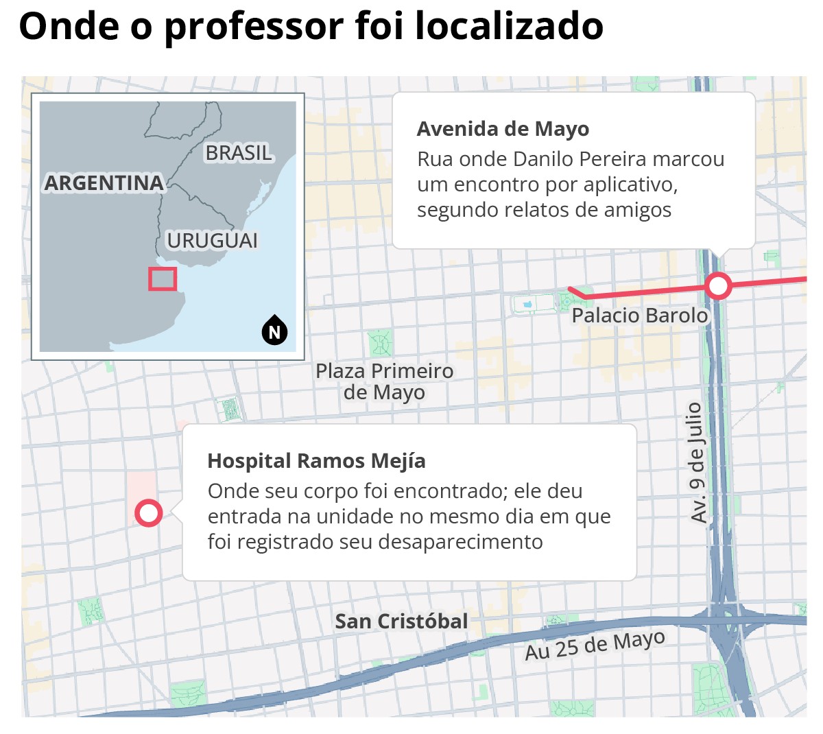 Danilo havia enviado sua última mensagem na madrugada de 14 de abril, pouco antes das 4h, a um amigo. No texto, informou que estava em um apartamento na Avenida de Mayo, onde teria marcado encontro com um jovem chileno conhecido por aplicativo de relacionamento. Como não respondeu mais às tentativas de contato, amigos registraram denúncia de desaparecimento na Fiscalía Nacional en lo Criminal y Correccional Nº 17.