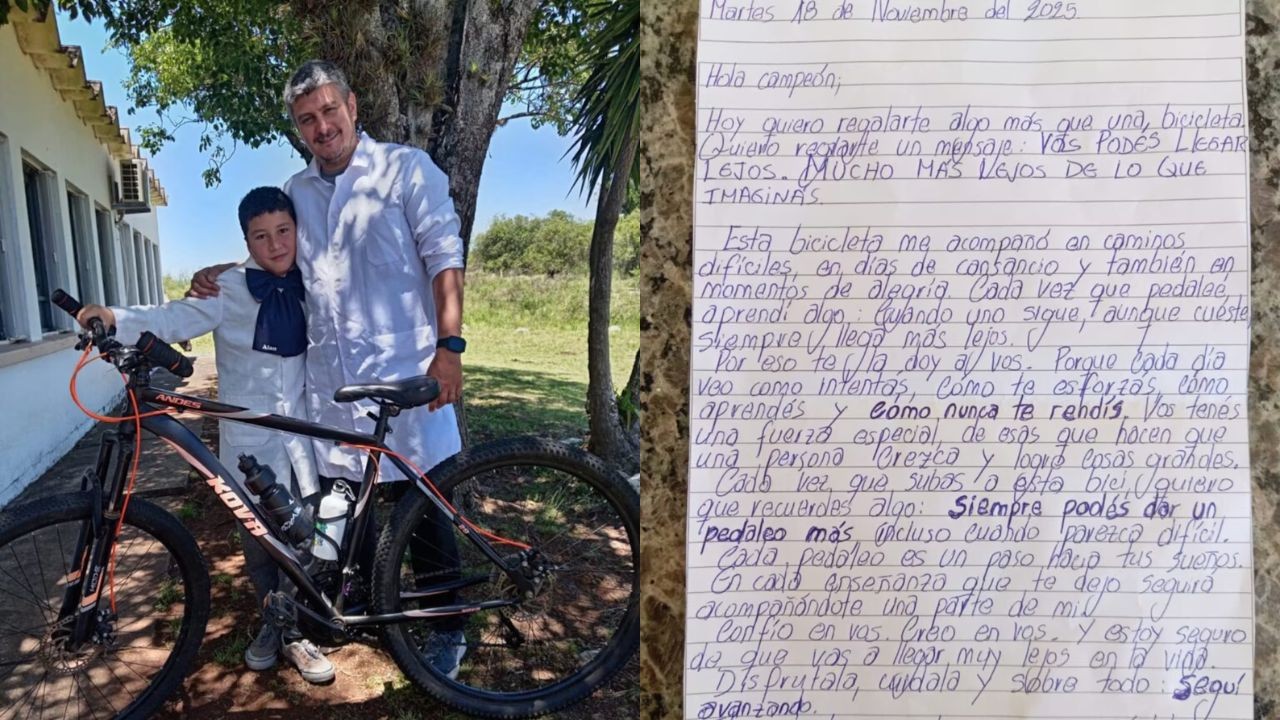 Nesta terça-feira (18), o professor Rodrigo Martínez, de 34 anos, surpreendeu seu aluno Alan, de uma escola rural no norte do Uruguai, com um presente que viralizou nas redes sociais: sua própria bicicleta, acompanhada de uma carta manuscrita.