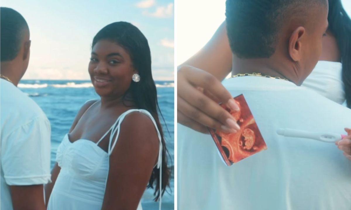 No registro, o casal aparece caminhando em uma praia, vestido de branco, em um cenário intimista. Durante as imagens, os dois exibem um teste de gravidez com resultado positivo e também mostram exames de ultrassom, confirmando a gestação.