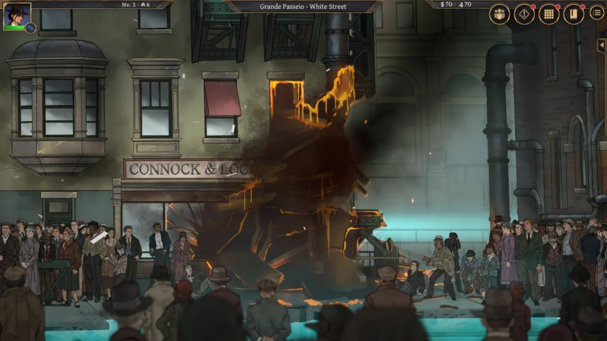 A história se passa em uma Nova York flutuante dos anos 1930, graças ao éter gravitacional. A estética “decopunk”, com forte influência noir, constrói um universo intrigante. Visualmente, o jogo impressiona, lembrando uma pintura estática, com toques que remetem a Gravity Rush e BioShock Infinite.