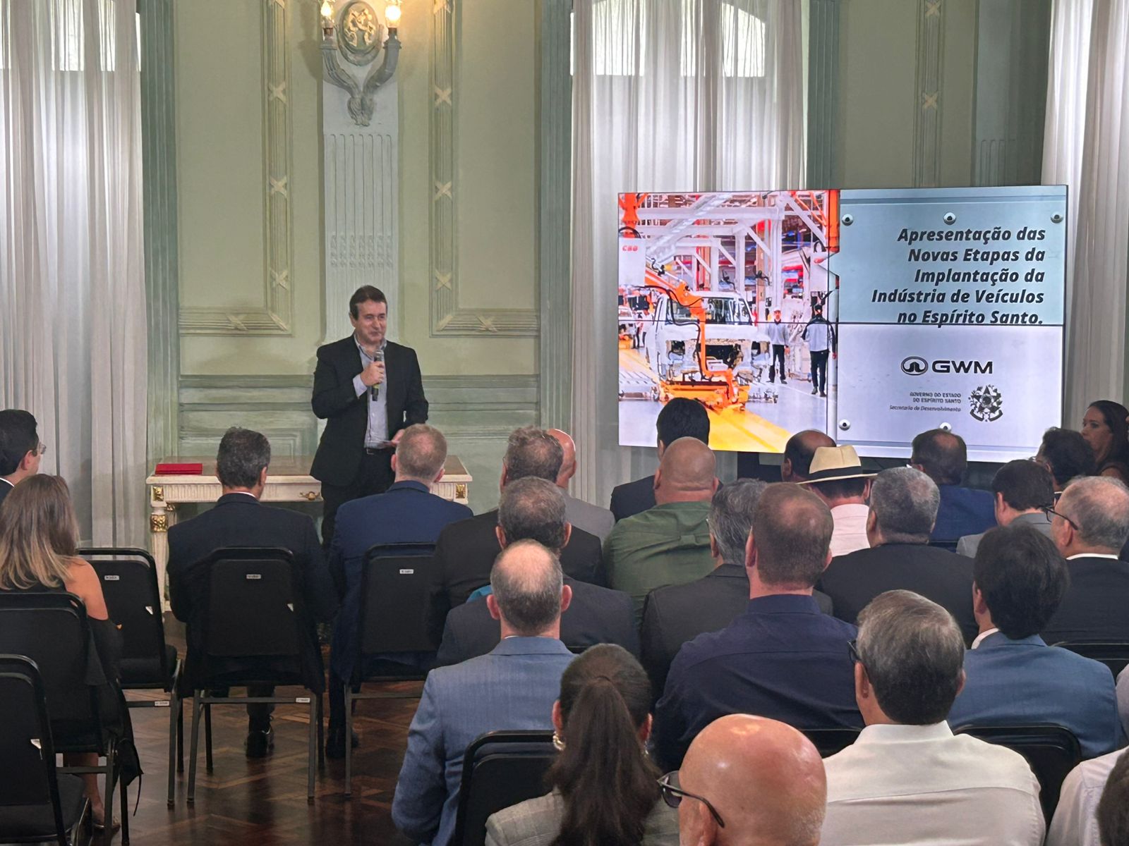Anúncio dos planos para a fábrica da GWM em Aracruz: capacidade de geral 10 mil empregos e fortalecer cadeia produtiva. Crédito: Edu KopernickDados foram apresentados em solenidade no Palácio Anchieta, com presença de representantes da GWM, convidados do setor produtivo bem como políticos e autoridades. A unidade será na região de Barra do Riacho, em Aracruz, dentro de uma área industrial superior a 1,7 milhão de metros quadrados