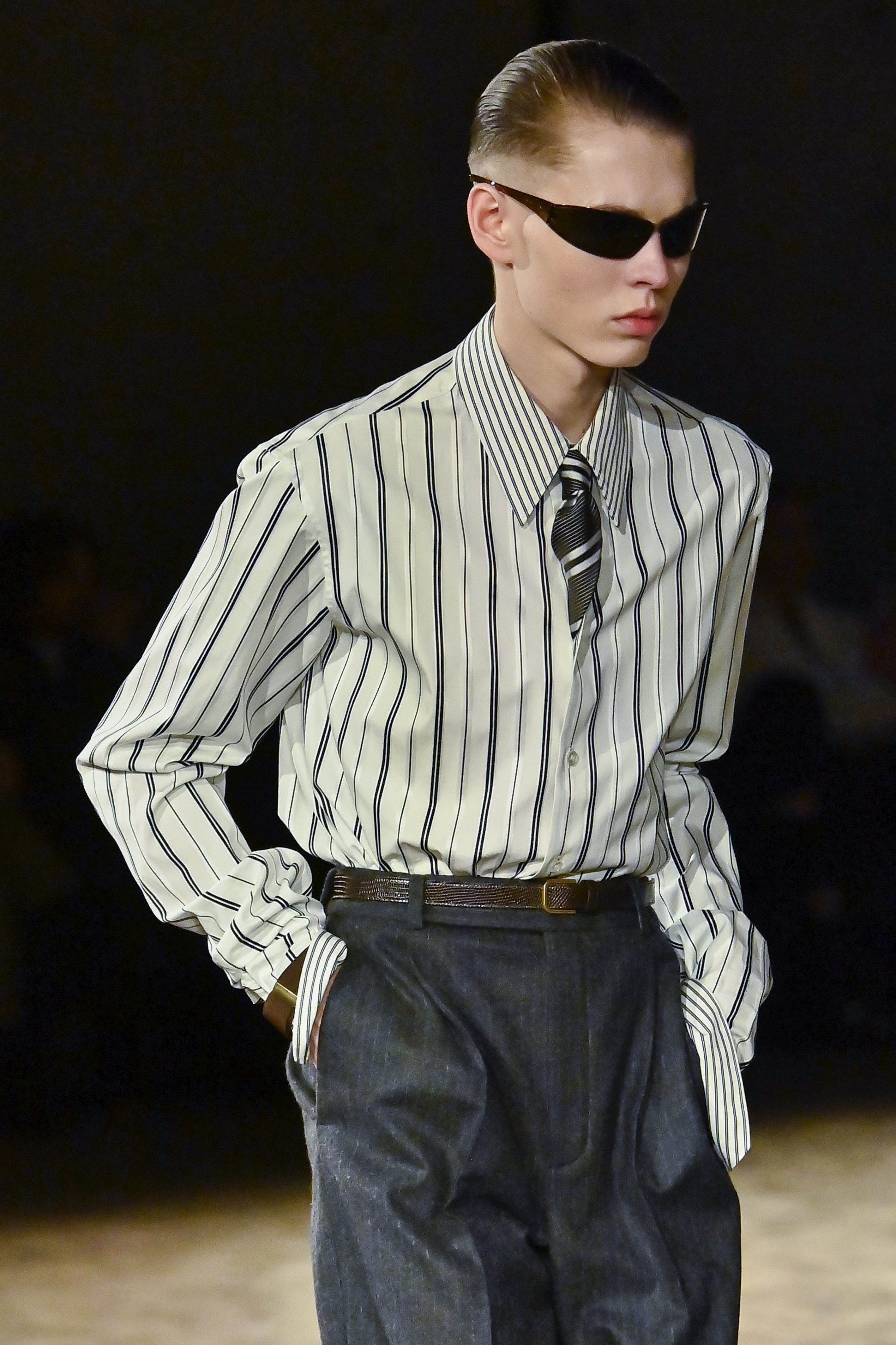 O styling teve papel fundamental na narrativa do desfile. Lenços substituÃram as gravatas, óculos escuros oversized imprimiram um clima noturno e enigmático, e blazers usados sem camisa trouxeram sensualidade sem comprometer a elegância. A paleta cromática transitou entre tons sóbrios e nuances de azul polido, construindo uma atmosfera introspectiva que evocou tanto o legado da maison quanto a visão pessoal de Vaccarello sobre o homem contemporâneo.
