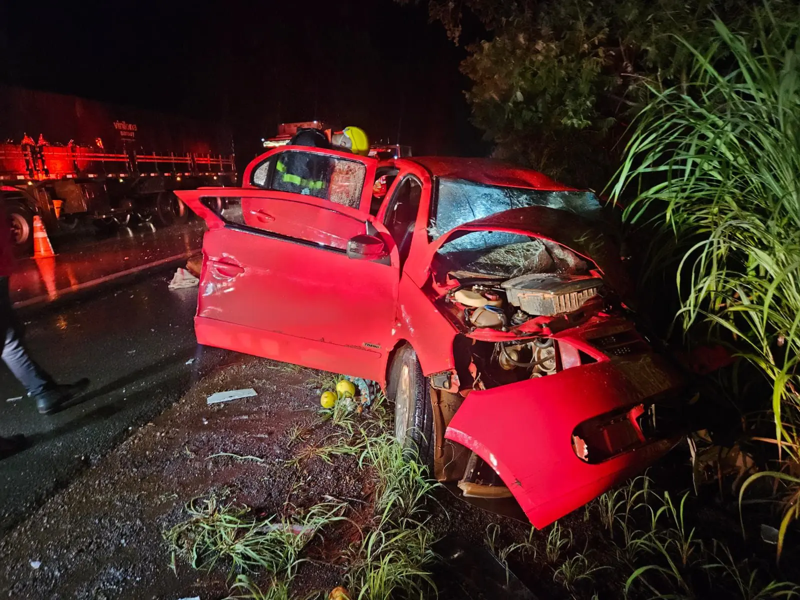Após o resgate das vítimas, a equipe dos bombeiros realizou a limpeza da pista devido ao vazamento de óleo na rodovia causado pelo acidente