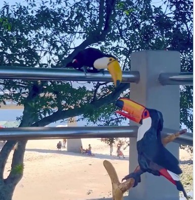 O momento da interação entre o animal silvestre e a escultura foi registrado pelo próprio artista e está viralizando nas redes sociais. Na gravação é possível ver que o tucano de verdade se aproxima aos poucos da obra de madeira, emitindo diferentes sons e olhando constantemente para a escultura, chegando até a bicá-la algumas vezes.