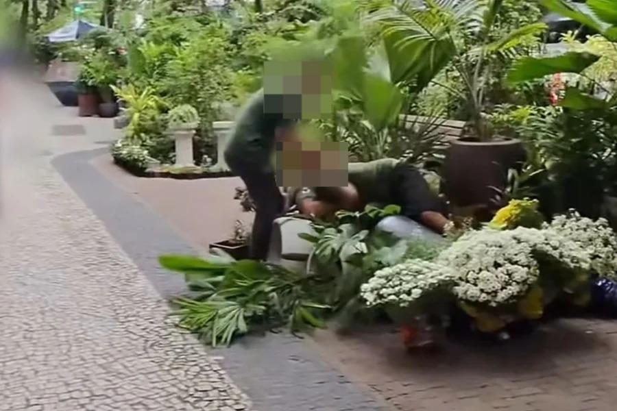 A discussão rapidamente se transforma em agressões físicas, e ambos caem sobre vasos e plantas expostos na loja, causando tumulto no interior do espaço.