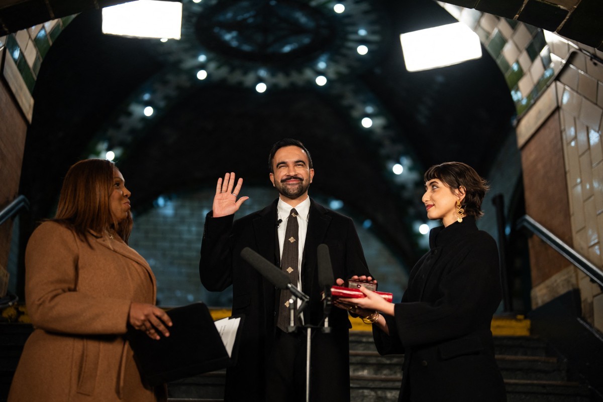 Após a virada do ano, Mamdani colocou a mão esquerda sobre dois alcorões, ergueu a mão direita e recitou o juramento de posse.